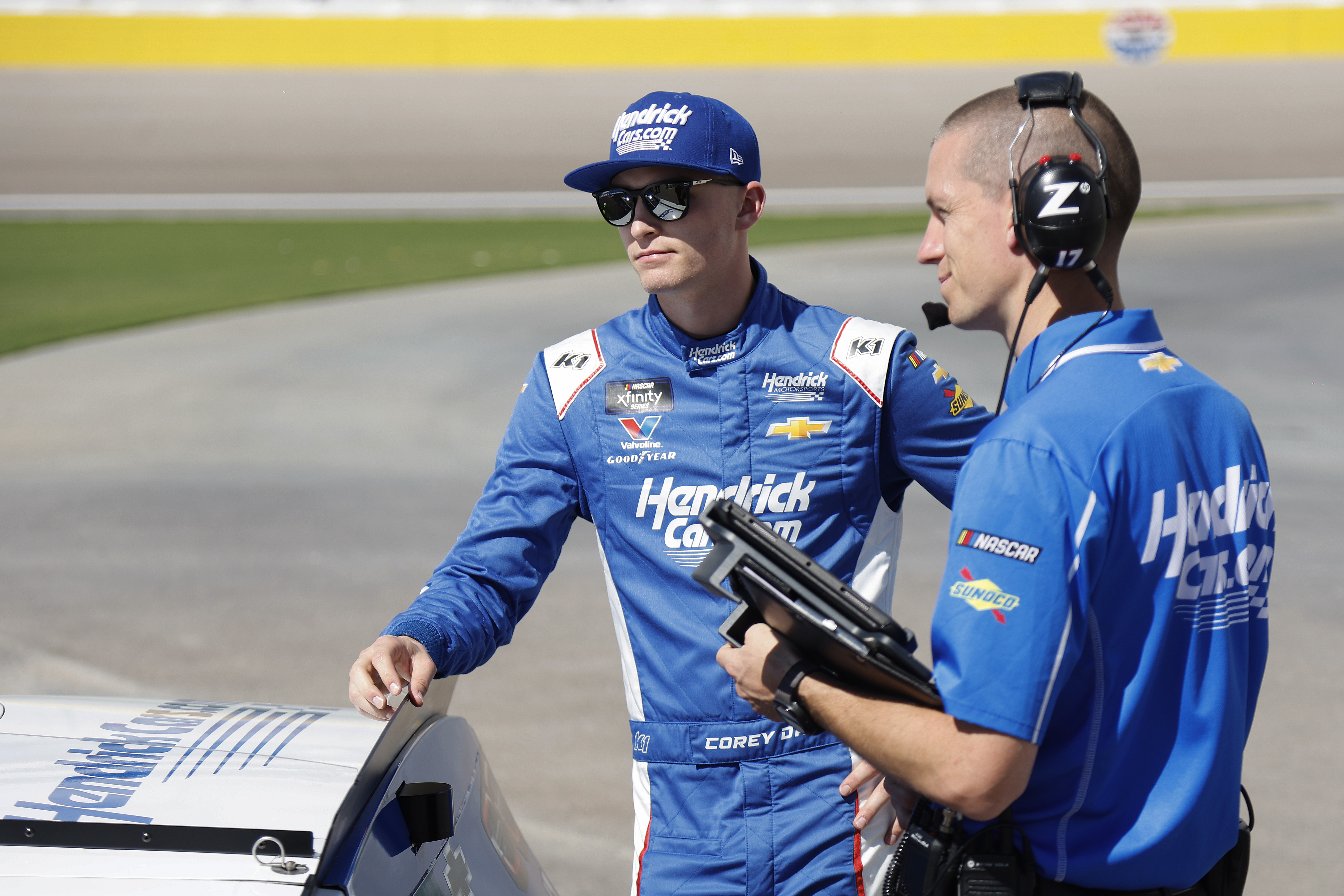 Driver Corey Day (left) talks to crew chief Adam Wall at Las Vegas Motor Speedway.