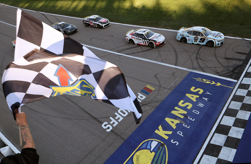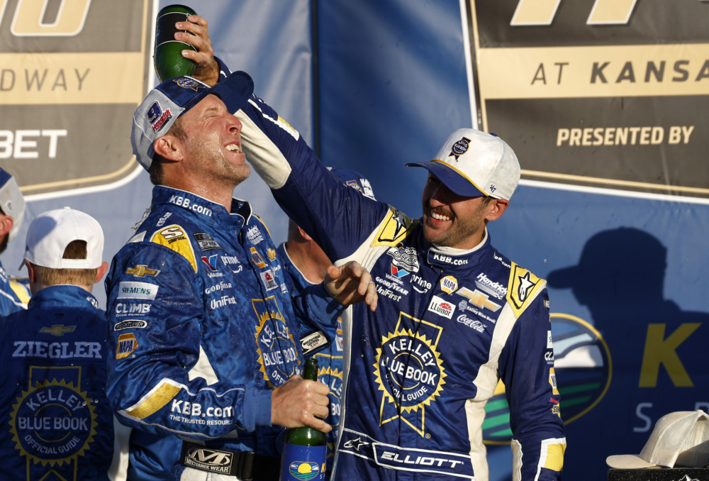 Chase Elliott roared from 10th to the lead during an overtime restart, rocketing to victory lane in a NASCAR Cup Series Round of 12 playoff race on Sunday at Kansas Speedway.