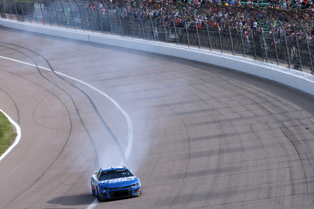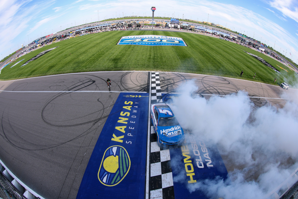 Kyle Larson set a new track record, leading 221 laps, sweeping the stages and registering the event's fastest lap in winning at Kansas Speedway on Sunday, May 11, 2025.